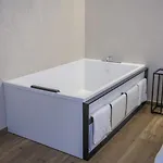 Bidé, badkar och dusch finns i badrummet.